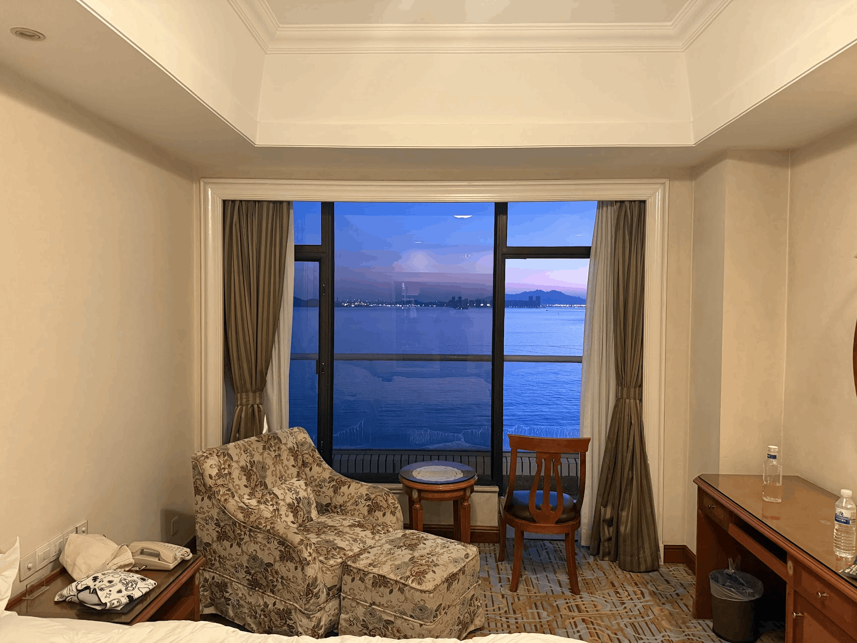 到酒店先吃了一顿 200 块的自助,在酒店 25 层的旋转餐厅 —— 这个餐厅居然真的会转,大概 90 分钟自转一圈,由于是附近最高(第二高?)的建筑,可以看到全部的海景和城景。