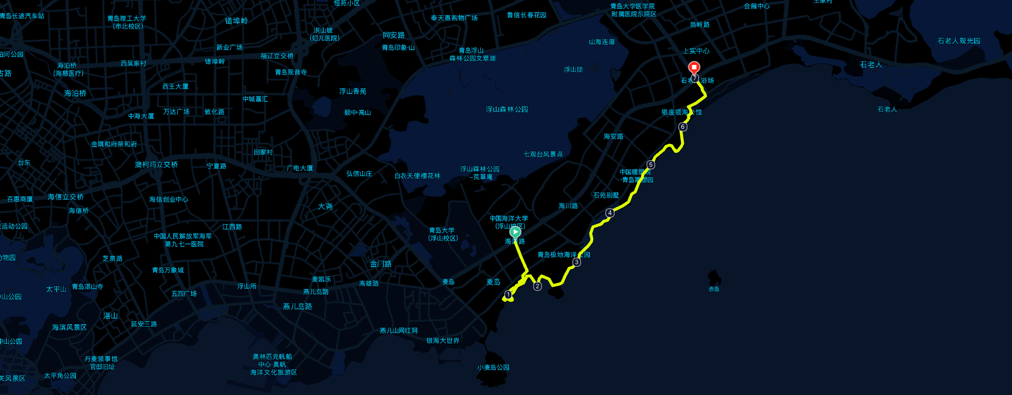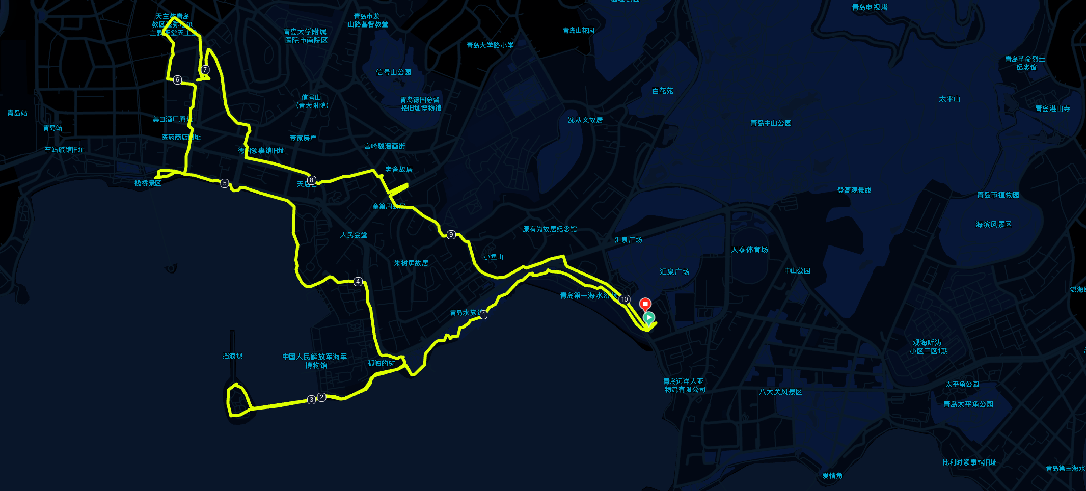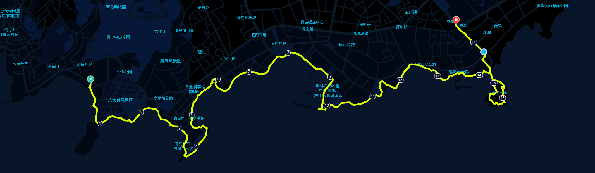 - day 02: 第一海水浴场 → 八大关 → 第二海水浴场 → 第三海水浴场 → 音乐广场 → 五四广场(五月的风) → 奥帆中心 → 燕岛山 → 情人坝 → 滨海绿道走完 → 小麦岛公园