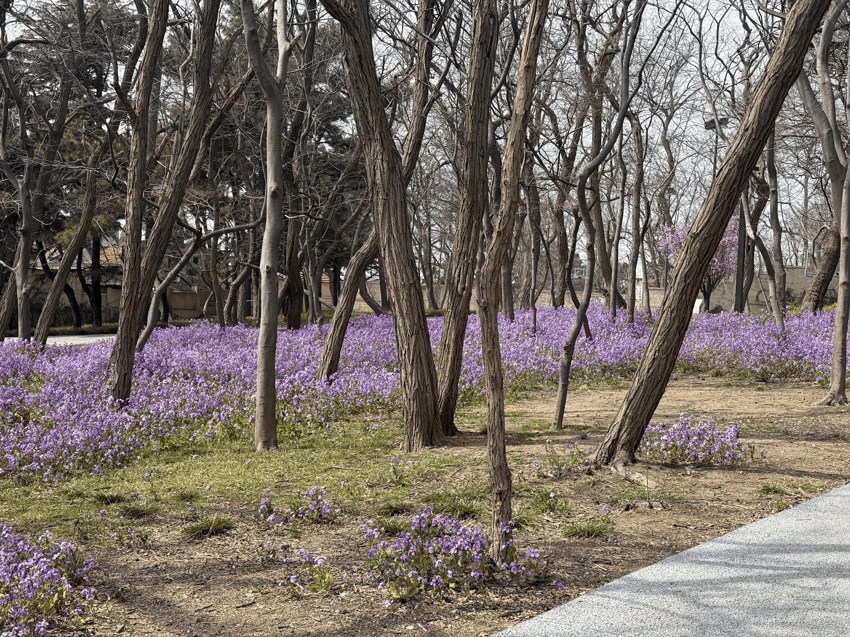 中午就已经抵达青岛站了,出来以后去了一个叫「团岛山」的公园,公园上开满了淡紫色的花,人特别特别少,即使离栈桥很近很近。